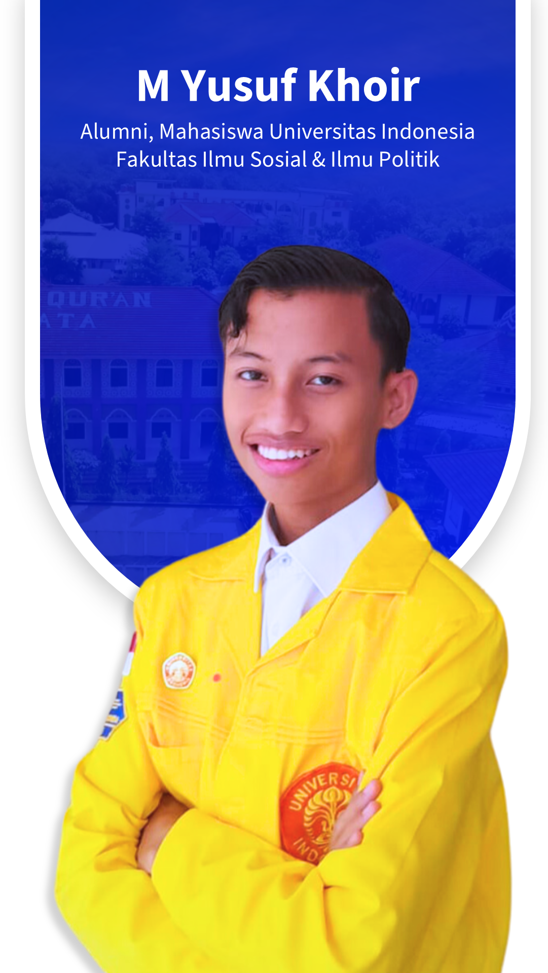 Berkuliah di Universitas Indonesia dengan almamater kuning yang membanggakan tidak pernah terbayangkan oleh saya. Saya jadi teringat awal mula perjuangan ditempa di Pondok Pesantren Baitul Qur'an Cirata. Sebagai anak santri dari pesantren pelosok, masuk ke kampus ini adalah sebuah kejutan. Bekal dari pondok mengajarkan kesabaran, pengorbanan, dan nilai Qur'ani yang membentuk mental pejuang. Kini, harapan saya adalah bisa mengangkat nama pondok tercinta setinggi-tingginya di kampus ini. Terima kasih untuk guru-guru yang luar biasa ikhlas dalam mendidik. Semoga pondok, santri, dan gurunya terus berkontribusi bagi pendidikan negeri.